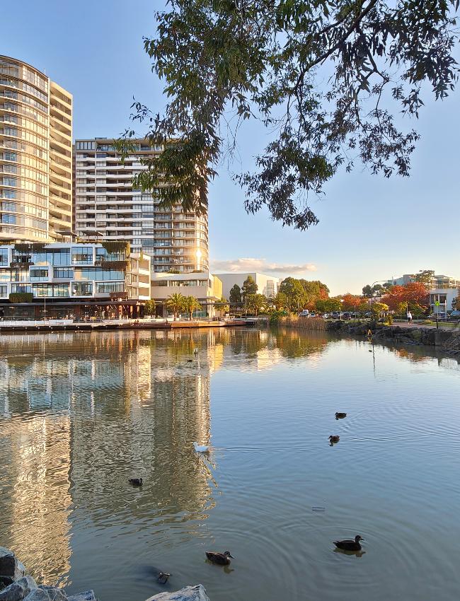 Buildings, pond, and ducks